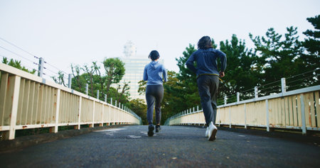 Outdoor, couple of friends and running for fitness at bridge for self care, wellness and health in Japan. People, back and jogging in Tokyo for exercise, cardio. and workout with support and love