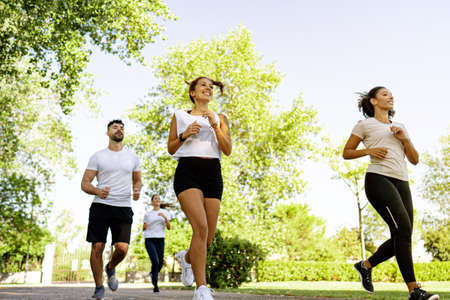 Group of diversity people wearing sportswear while jogging together at the park