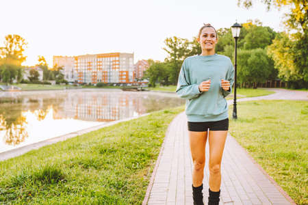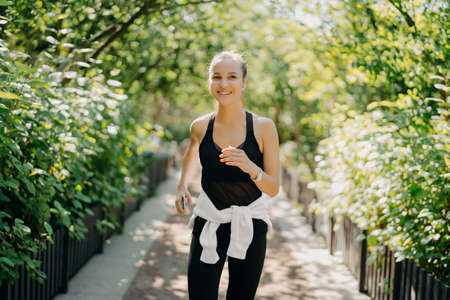 Sportive young woman has jogging workout training runs outdoor smiles pleasantly enjoys good day dressed in sportsclothes listens music from playlist. Start day from morning jog. Female runner