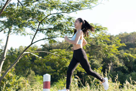 Asian Young female athlete jogging in forest. Jogger doing morning physical training.