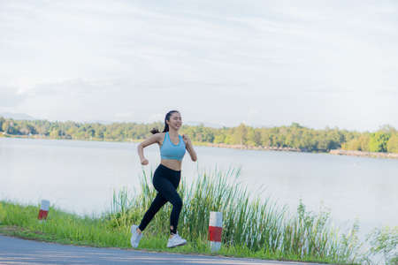 Asian woman jogging in the park, healthy lifestyle and sports concept. woman jogging in the park in sunlight on a beautiful summer day