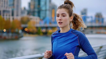 A focused young woman jogs along a river in a vibrant urban landscape. She wears a blue athletic shirt, embodying health and motivation on a cool day.