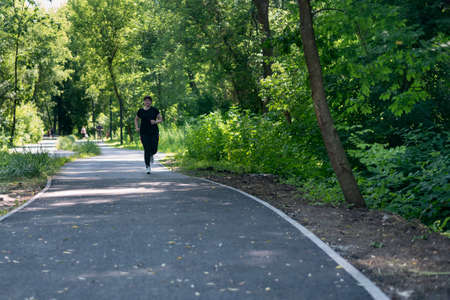 Young woman with weight excess runs in the park. Girl with curvy figure goes in for sports to lose extra pounds