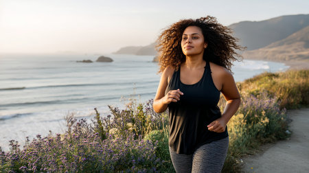 A plus-size woman jogging along a scenic coastal path, with the ocean in the background.