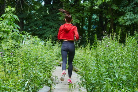 Sporty young woman running or jogging on the roadside in nature. Healthy lifestyle concept.