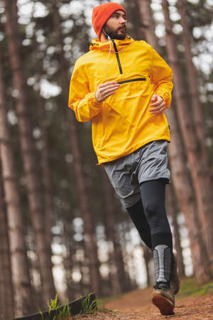 Detail of a man working out outdoors on a cloudy autumn day, walking down the jogging track