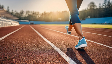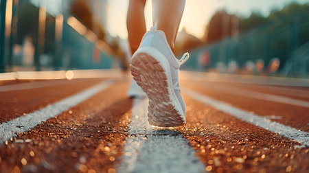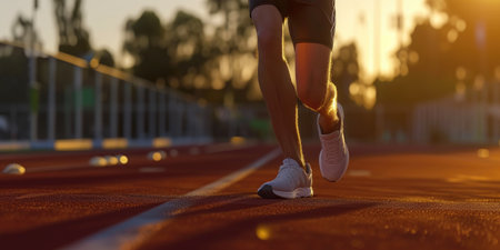 Close shot of runner's legs and shoes on track at dawn, vibrant fitness lifestyle scene.