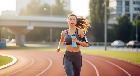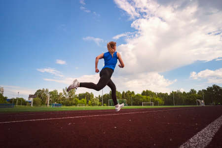Athletic woman in sport clothes running on stadium track. Female runner jogging for exercise. Workout Healthy lifestyle concept.