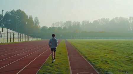 A peaceful view of an empty running track bathed in soft morning light, shrouded in mist, inviting fitness enthusiasts to embrace a tranquil workout session.