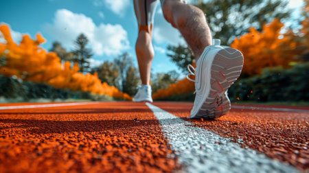 Close-up of runner's feet in sports shoes at track start line. for sports, motivation, new beginnings, fitness goals, and athletic competition themes.