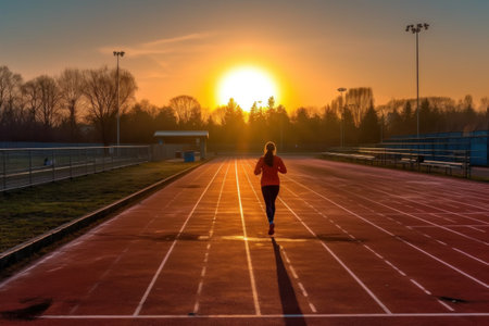 Runner on Track at Sunrise in Outdoor Stadium: Fitness, Athletics, Training, Health, Sports