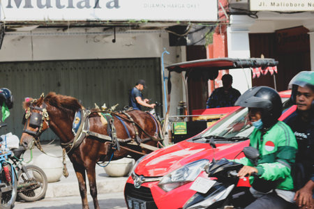 Yogyakarta, Indonesia on October 23, 2022. Andong or horse-drawn carriage with its coachman parked on Jalan Malioboro, waiting for passengers. Usually tourists who are on vacation to Yogyakarta drive it.