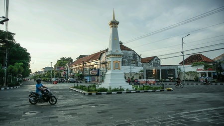 Yogyakarta, Indonesia, May 17, 2017. Tugu Golong Gilig or Pal Putih is busy with vehicles passing by at dusk, one of the city's landmark spots that has a lot of history
