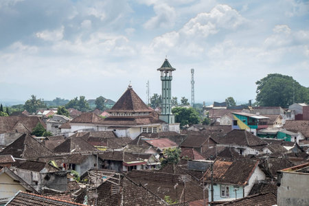 City landscape, top view, against the sunset. Yogyakarta, Jawa, Indonesia.