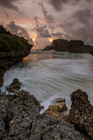 Amazing view of Yogyakarta seascape with natural coastal rock as foreground