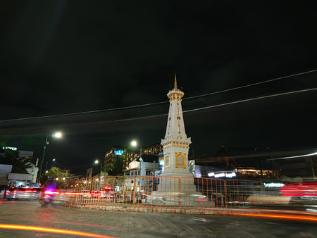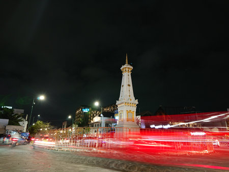 Yogyakarta, Indonesia - July 16, 2019: Tugu, famous symbol that represents the city of Yogyakarta, is surrounded by night traffic
