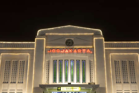 Jogjakarta, Special Region of Jogjakarta, Indonesia - July 16, 2019: Main side entrance to the ticket checking area of Jogjakarta central train station at night.