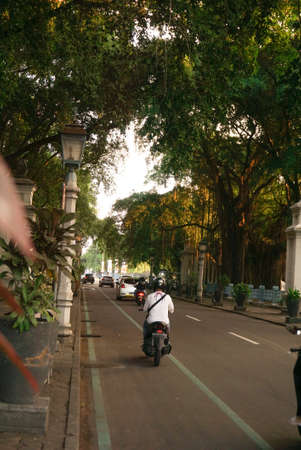 A long and straight highway in Jakarta Indonesia as seen from above the bridge, on the right side there are shady trees that grow well.