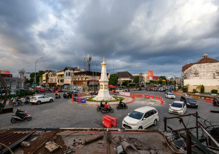 Yogyakarta, Indonesia, May 17, 2017. Tugu Golong Gilig or Pal Putih is busy with vehicles passing by at dusk, one of the city's landmark spots that has a lot of history