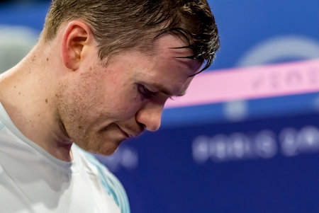 KALLE KOLJONEN of Finland (FIN) competes against KUNLAVUT VITIDSARN of Thailand (THA) at the Porte de La Chapelle Arena during the Badminton match at the 2024 Paris Summer Olympics in Paris, France. Kalle has to withdraw from competition due to an injury to his calf.