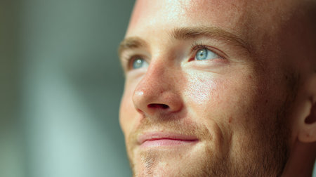 A young man with a shaved head and striking blue eyes gazes upward with a gentle smile, captured indoors with natural light enhancing his features.