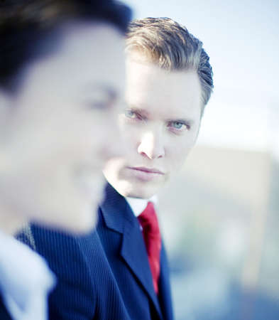 handsome businessman looking at camera while businesswoman looks forward