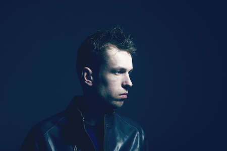 Portrait of an emotional handsome young man, on a black background in the studio, who stands in a brooding pose. Expression of emotions and feelings