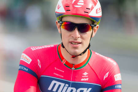 Minsk, Belarus-July 8, 2017: Professional Road Cyclist Evgeny Korolek Poses as a Winner of the International Road Cycling Competition Grand Prix Minsk-2017 on July 8, 2017 in Minsk, Republic of Belarus.