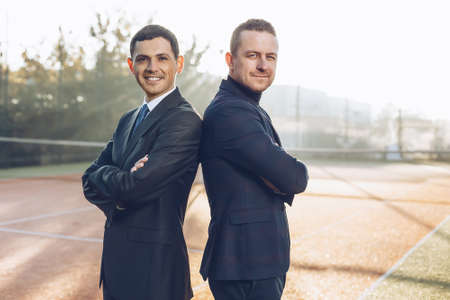 Two handsome young businessmen in classic clothes are looking at camera and smiling, standing in sunlight with crossed arms, back to back, outdoors. Business and sport.