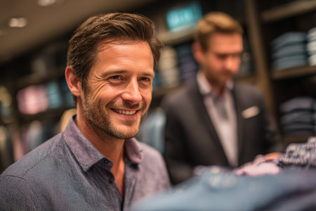 Smiling man is browsing clothing in a modern retail store, surrounded by neatly arranged garments and a warm shopping atmosphere.