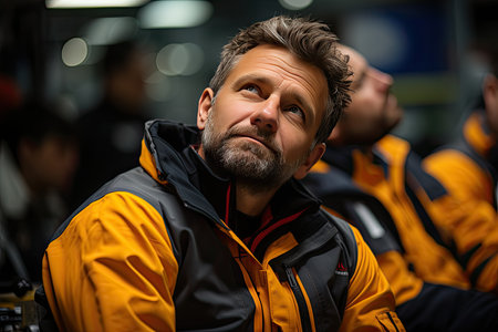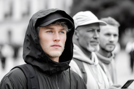 Young man wearing a hoodie looking away with older men in the background, highlighting youth