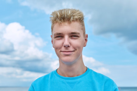 Headshot portrait of handsome smiling teenage guy, blue sky