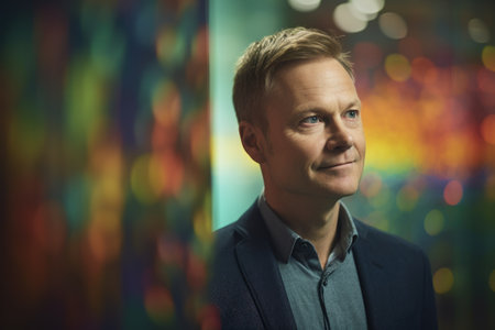 Mature smart swedish businessman, smiling face, standing in blur background of creative colorful office interior design. Generative AI AIG20.