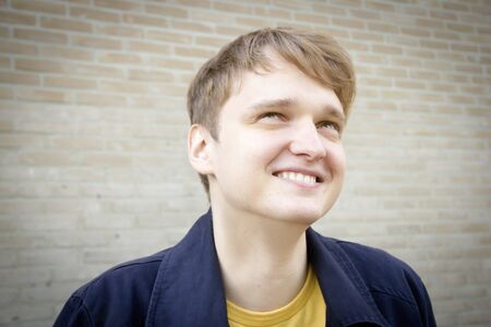 Handsome young man against brick wall smiling. Candid.