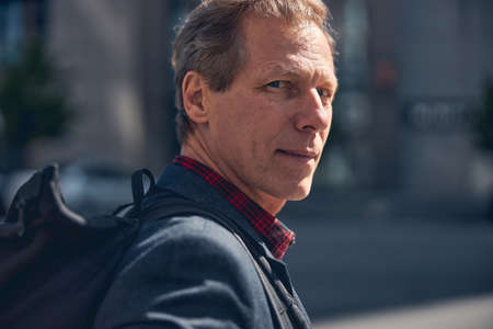 Close up of handsome gentleman looking at camera while spending time outdoors