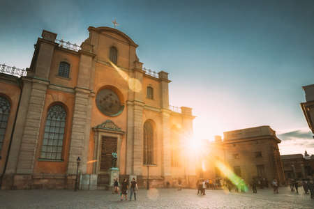 Stockholm, Sweden. People Walking Near Great Church Or Church Of St. Nicholas In Gamla Stan In Summer Evening. Famous Popular Destination Scenic Place In Sunshine Lights. UNESCO World Heritage Site.