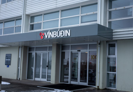 Reykjavik, Iceland - March 22, 2022: Entrance to Vinbudin alcohol store, chain belonging to the State Alcohol and Tobacco Company of Iceland.