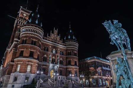 HELSINGBORG, SWEDEN - OCTOBER 29 2019: The neogothic style town hall building at night in Helsingborg, Sweden.