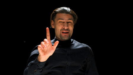 Actor speaking emotionally on stage. Stock footage. Charismatic man speaks and gestures on stage. Actor is actively talking on stage with audience in dark