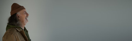 profile of overjoyed senior man in brown jacket and beanie hat laughing on grey background, hipster fashion, happy and fashionable aging concept, banner with copy space