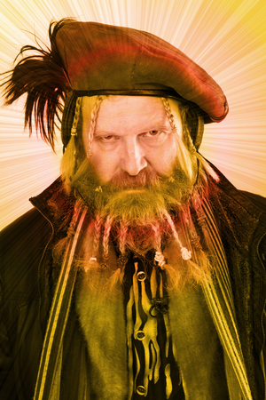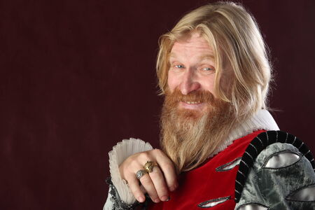 close-up portrait of an adult male with long blond hair beard and mustache in medieval costume studio on a burgundy background
