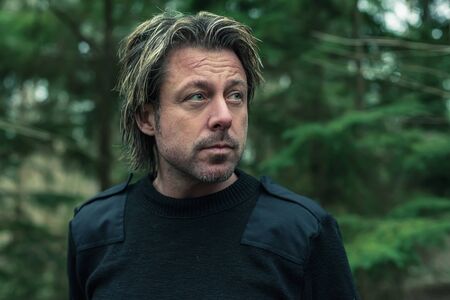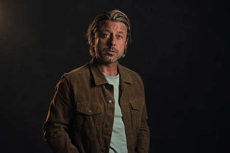 Dark portrait of a tough man with blond hair and a gray stubble in a dark brown t-shirt.