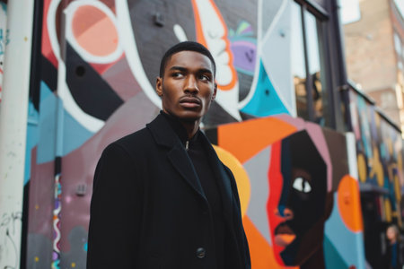 Fashionable young man in black coat posing confidently against a vibrant, artistic mural backdrop AI