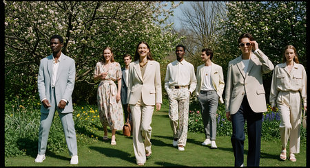 Group of diverse young adults with stylish outfits posing confidently on a dark background.