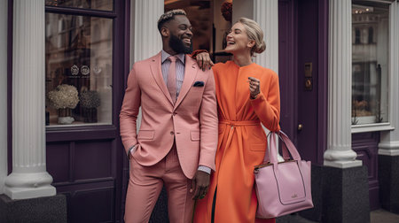 A stylish couple, one in a chic dress and the other in a dapper suit exit a designer boutique. The woman's bag is a lively shade of lavender while the man's is a vibrant shade of coral. Both are laughing heartily clearly delighted with their purchases.