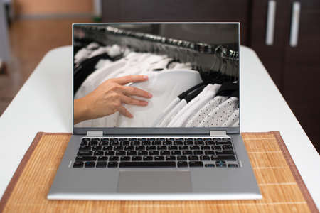 Female hand choose some clothes hanging on a hanger in the store on laptop screen, close up, selective focus.