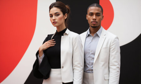 A minimalist, high-fashion model standing in front of an abstract geometric backdrop with bold colors A modern, high-fashion model striking