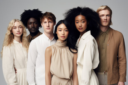 Group of young African American adults in beige attire standing against neutral background, AI generated