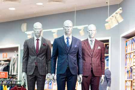 Three mannequins dressed in classic costumes, in a shop window. Shopping and consumerism.