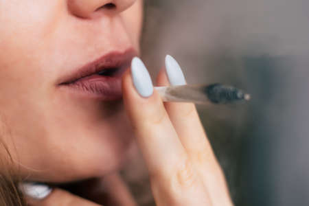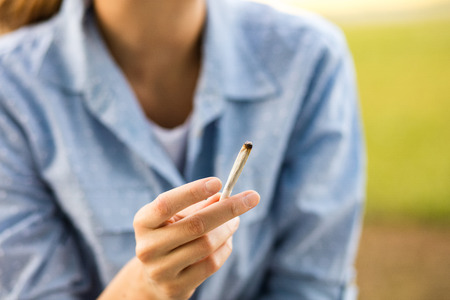 Girl smoking medical marijuana joint outdoors. The young women smoke cannabis blunt, close-up. Cannabis is a concept of herbal medicine.